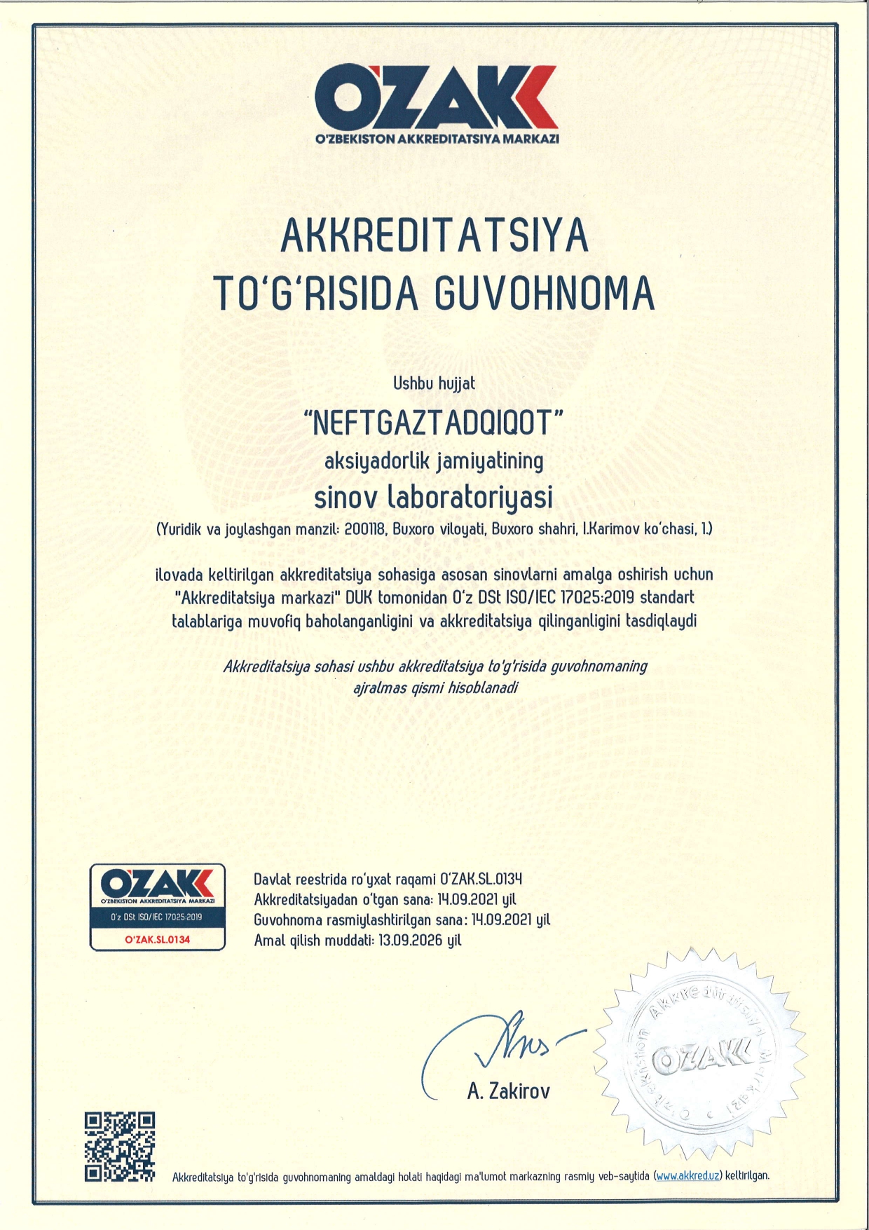«Neftgaztadqiqot» AJ tarkibidagi neft va gazni qayta ishlash mahsulotlari sinov laboratoriyasi O‘zbekiston Respublikasi Milliy sertifikatlashtirish tizimida akkreditatsiya qilingan.